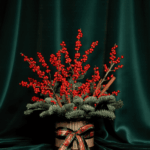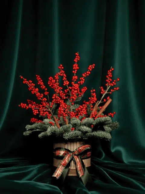 LUXURY CHRISTMAS ARRANGEMENT WITH RED ILEX AND PINE IN A GOLD BOX
