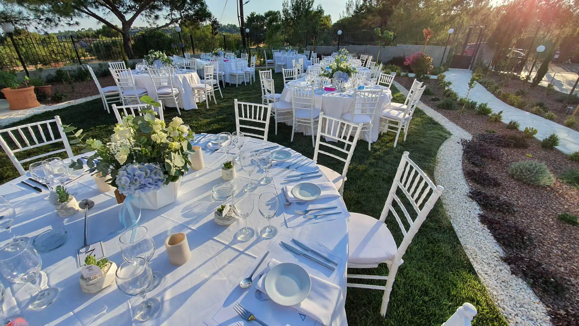 This summer garden Christening was a beautifully elegant and refreshing celebration for a baby boy, set in the lush gardens of a private residence in the foothills of the Troodos Mountains. The theme centered around baby blue, creating a soft and sophisticated atmosphere. The floral arrangements featured stunning blue hydrangeas (hortensias) as the focal point, perfectly complemented by delicate white lisianthus, fresh eucalyptus, and white limonium for added texture and depth. The breathtaking natural surroundings, combined with the serene blue and white color palette, made this luxury Christening decor a truly magical and unforgettable experience.