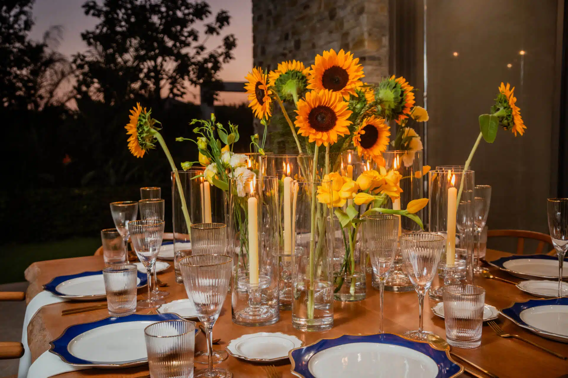 A private dinner party brought old friends together for a heartfelt reunion at an elegant private residence. Set in a lush tropical garden, the outdoor setting at dusk was illuminated by yellow candles in glass jars, casting a warm, golden glow. Sunflowers, symbolizing happiness, loyalty, and resilience, adorned the tables, complementing the regal blue and gold tableware. The vibrant sunset hues blended seamlessly with the yellow floral arrangements, creating a luxurious yet intimate ambiance. Fine crockery and cutlery elevated the high-class affair, making it an unforgettable evening of friendship, elegance, and timeless memories under the fading golden light.